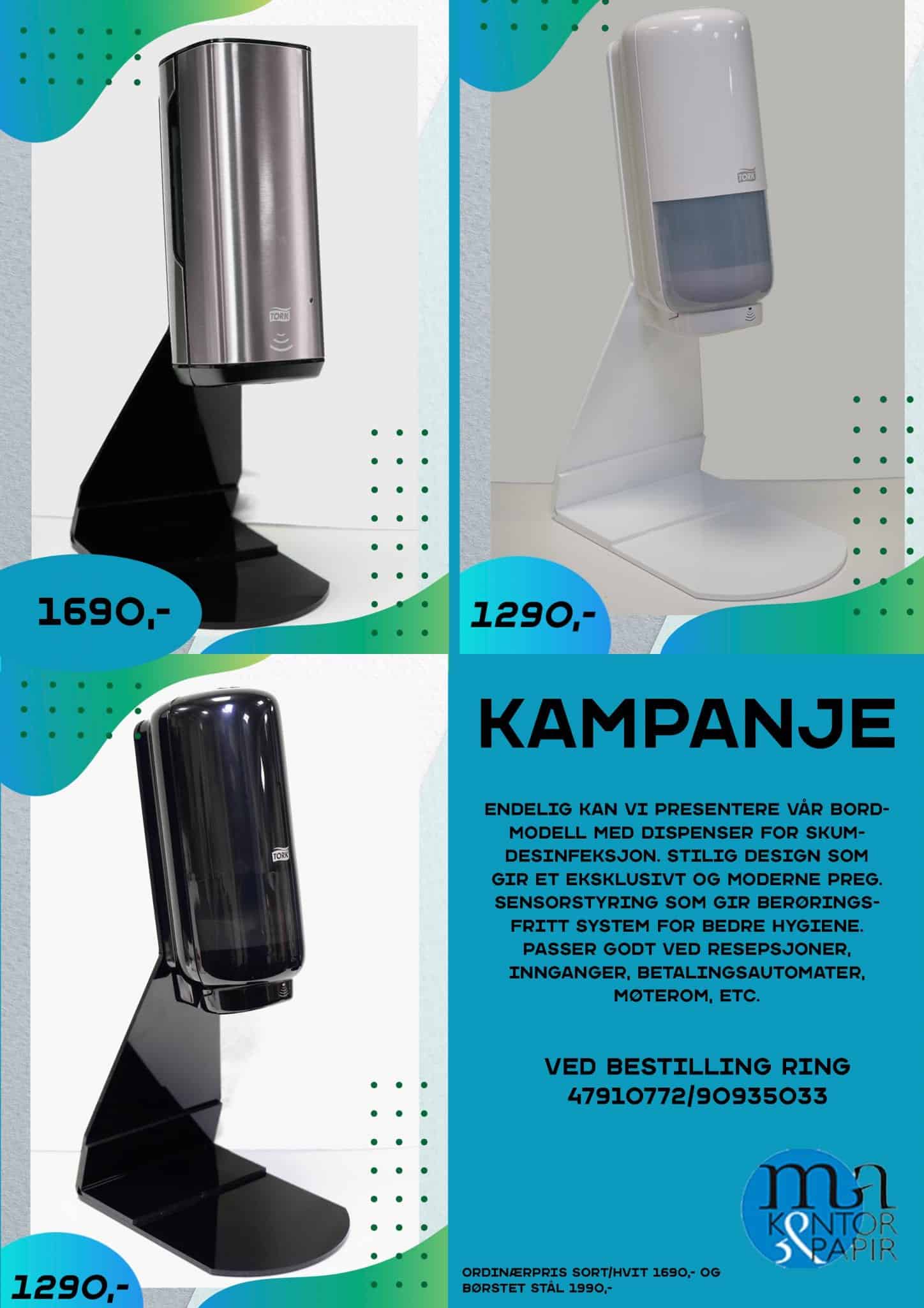 Berøringsfrie dispensere, overflatedesinfeksjon, servietter, skum, gel, etc.